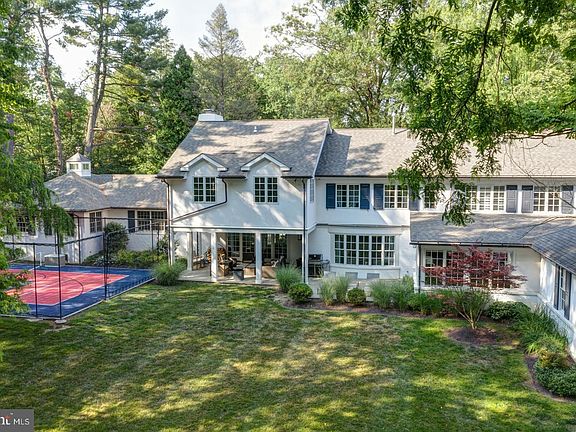 Beautifully set on one of Wyndmoor~s most desirable streets is this stunning home with classic good looks. Perfectly set back and flanked on all sides by well maintained gardens and mature trees, this home affords you the comfort and privacy of a true country estate, and it~s just a short drive to Chestnut Hill! Enter through the most charming original front door, into a spacious foyer with a gracefully curved staircase. The heart of this home is the spectacular chef~s kitchen. What a dream- with a double Viking stove, expansive marble topped island, butler~s pantry, marble sink and backsplashes, custom cabinetry, luxury fixtures, and integrated appliances. This open concept kitchen overlooks a great room with coffered ceilings and two walls of windows for bucolic views and natural light. The great room comfortably incorporates the family room and an oversized dining table large enough to entertain.For more formal entertaining, there is a separate dining room, formal sitting room, and a living room with a working fireplace, each with elegant details and walls of windows which open out to the covered patio. There are several patio seating areas for outdoor dining or lounging, and an abundance of spaces for socializing and relaxing.On the second level, we have 3 perfectly sized bedroom suites on one end of the center hall. Each attached bath is a little different in style, but equally finely appointed with beautiful tile work. On the other side of the hall, we have the master~s wing, complete with two walk-in closets, and an exquisite and artfully tiled master bath with a gorgeous double slipper tub, 2 vanities, and a walk-in shower. The master bedroom has vaulted ceilings and french doors opening out to a sizable balcony. Additional features include a fully private guest suite, with an oversized living room, a serene bedroom, both with custom built-ins, and a full marble bath. The whole house audio system and sport court for tennis and basketball keeps everyone entertained! Off street parking and a 2 car garage. This house conveys with a subdividable lot that is now a side yard with a small grove of trees.There is no better place to call home!