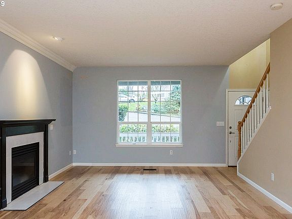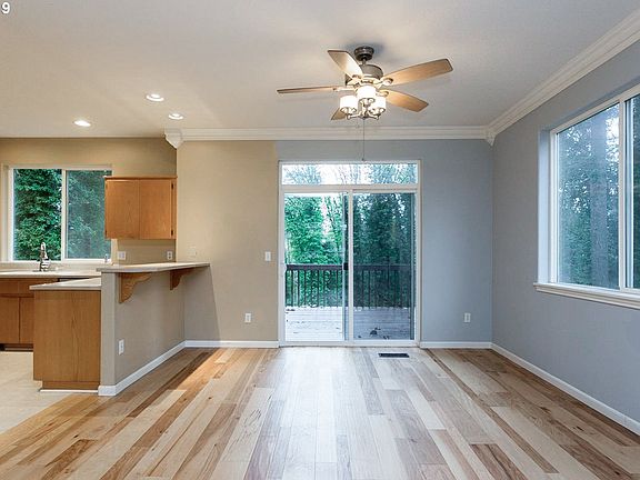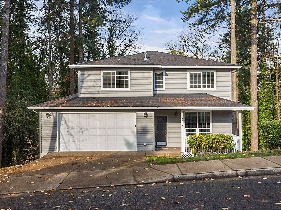 This Oregon City two-story home offers a gas fireplace, stainless steel appliances, a back deck, a covered front porch, and a two-car garage.