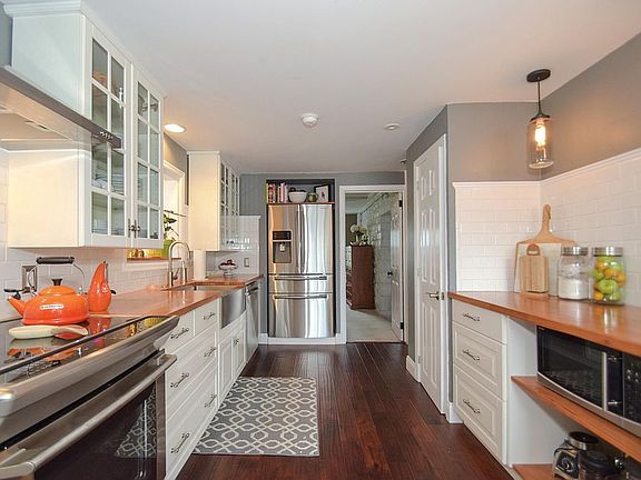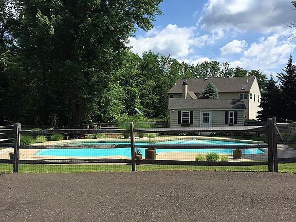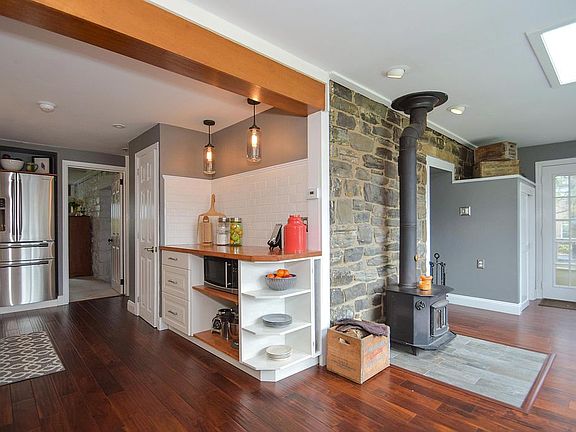 Charm and character best describe this modern, stone and cedar two story home with wraparound porch, conveniently located to local shopping and sought after North Penn School District. Walk into the open kitchen and you will find hand-scraped hardwood flooring, beautiful full-sized windows that provide plenty of natural light and a perfect view of the back yard. The potbelly stove provides a centerpiece for the family to gather around during those long winter days. This entryway opens-up to the wide galley kitchen that features hi-end stainless steel appliances, custom butcher block countertops and white cabinetry. Just off the kitchen, you'll find a gorgeous, naturally lit formal dining room, lined with windows and skylights perfect for family gatherings. At the other end of the kitchen is access to the first-floor master bedroom and living room. The master bedroom is light and airy and features a large closet, built-in window seat with shelving, and attached master bath. The master bath has been recently remodeled to include a subway tile shower with modern frameless glass door, porcelain tile floors and rustic vanity. Off the master, you'll also find convenient access to the basement laundry room. The open living room features original hardwood floors and carpeting, and a second wood-burning fireplace with natural wood mantle, perfect for snuggling up during the holidays. From the living room, head upstairs to find the second bedroom with original hardwood floors, plenty of light and spacious closets. The third bedroom, just past the hall bath, has ample space that is perfect for a cozy bedroom or private home office. The updated bathroom features porcelain penny tile floors, stylish sink and vanity with chrome sconce light fixtures. Back outside, beyond the wide driveway with plenty of space for parking and detached two-car garage, is a nicely-sized fenced in yard with pool and recently updated pool-house. The pool area features new decking with patio area, redone just this past year, a new pump, and lush, landscaped grasses that line the pool and create privacy for sunny, summer days.