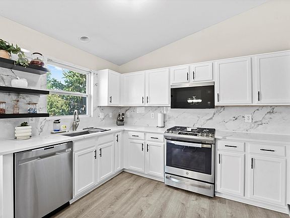 MULTIPLE OFFERS RECEIVED. H&B DUE THURS 8/21 6PM. You will be IN ABSOLUTE AWE as soon as you step inside this beautifully maintained 3-bedroom, 2-bath split-level home. The welcoming foyer with soaring vaulted ceilings opens into a versatile living space that can easily double as a formal dining room. The open-concept kitchen includes an updated kitchen with stylish white cabinets with gorgeous backsplash and quartz counters, all stainless steel appliances, and sleek vinyl plank flooring. Living room has vaulted ceilings with a beautiful stone wall and fireplace. Upstairs, you'll find a spacious primary bedroom with a walk-in closet, a full bath, and two additional bedrooms. The sunlit lower level features an expansive family room, dedicated office space, laundry area, and a second full bath, ideal for everyday living and entertaining. Need storage? The sub-basement has you covered. Yes that's right 4 levels! Outside, relax or entertain on the stamped concrete patio in your fully fenced backyard. Located in a corner lot, so much space inside and out!