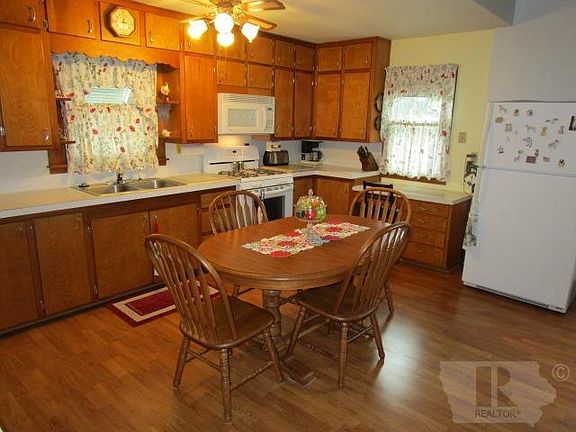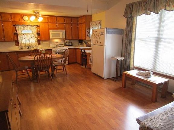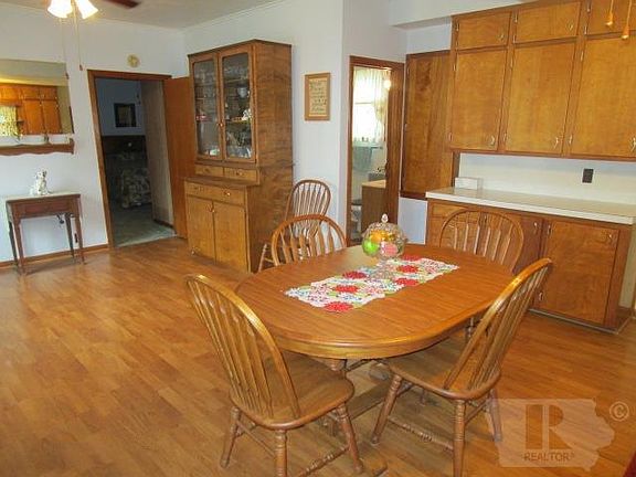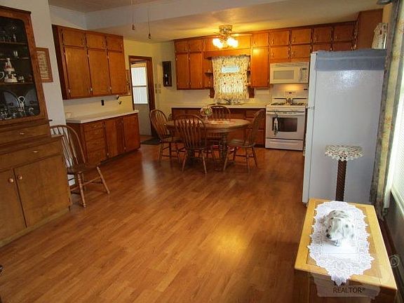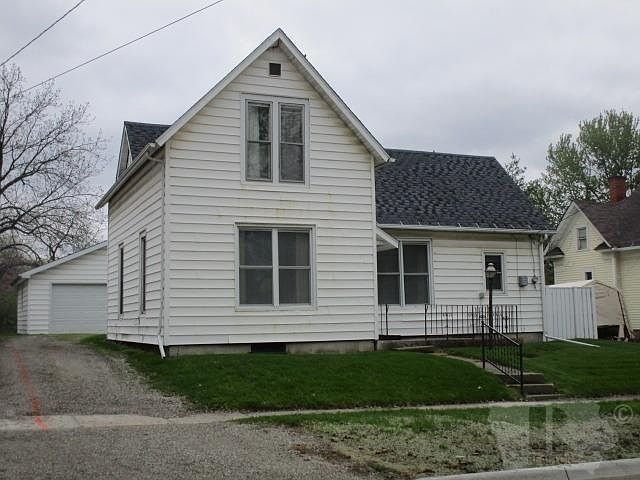 Be sure to look at this well-maintained 3-bedroom home with a nice floorplan. Current owner has been there over 50 years. Step into the front living room that provides a nice view through the picture window and opens to the larger-than-most kitchen and dining room---providing a great room effect. With appliances, built-ins, pantry, ample cupboards & counterspace the kitchen is the focal point. There is space for everyone as well as your dining room furniture. Main-level bedroom with two closets. Bathroom with step-in shower & laundry hookups. Upstairs with Jack-and-Jill bedrooms, each with closets. Covered back porch perfect for relaxing. Fenced-in rear yard. Steel siding. Two-car detached garage.