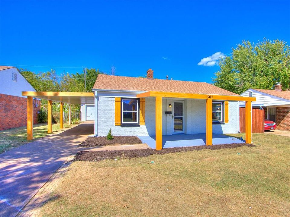 WELCOME HOME TO YOUR NEWLY REMODELED GEM - Located in the heart of Midwest City! This tastefully updated home offers comfort, convenience, and a peace. The open layout seamlessly connects the living room, dining area and kitchen, providing the perfect space for entertaining guests or enjoying family/friend gatherings enjoying your cozy electric fireplace. The large kitchen provides plenty of counter and cabinet space. Attractive countertops/backsplash and sink! Brand new Frigidaire appliances including a gas stove! New, wood-like flooring throughout compliments the updates throughout the entire home. Energy efficient windows throughout home offers lower energy costs. Bedrooms feature ceiling fans and adorable closet barn doors! Bathroom selections are ideal - the black hexagon-shaped tile blends nicely with the shower tile, vanity and lighting. The large, detached garage offers ample room for a vehicle and more, providing built-in shelving and tons of storage space. Nice sized carport surrounded with newly replaced cedar posts. The backyard provides outdoor enjoyment for family, friends and pets. Convenient access to shopping, dining, parks, and top-rated schools. Easy access to major highways, 5 minutes to Tinker AFB and 10 minutes to Downtown OKC. DON'T MISS OUT ON THIS ONE!!