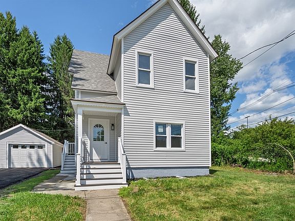 Welcome to this stunningly renovated 4-bedroom, 1.5-bathroom colonial, situated on a generous 1/3 acre lot. This home features an oversized 1-car garage and a completely remodeled interior, offering a modern and inviting space for comfortable living. The kitchen features luxurious quartz countertops, stainless steel appliances, a stylish tile backsplash, and a convenient breakfast bar, while the spacious layout seamlessly connects the large kitchen, dining room, and living room, ideal for family gatherings and entertaining. A 1st-floor bedroom and a dedicated laundry room complete the main level. Upstairs, you’ll find 3 well-sized bedrooms and a half bath. Step outside to a large yard and a back deck, perfect for entertaining, relaxing, or enjoying outdoor activities. Other updates include new laminate and tile flooring throughout, brand new siding, new composite porch and stairs, a freshly paved driveway and more. Motivated Seller! Schedule your showing today!