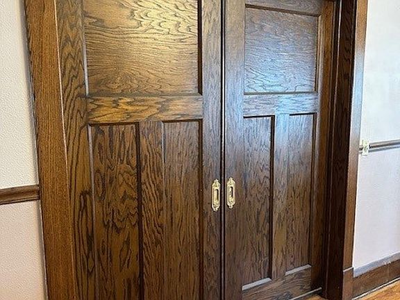 Decorative fireplaceLarge room upstairsDining roomKnotty pine panelingHardwood under carpet