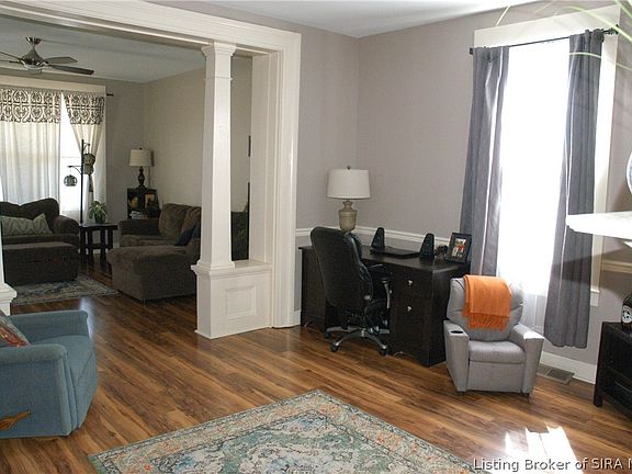 Welcome home to this warm and inviting 2 bedroom bungalow. Approaching this charming home you will notice the unique stone wall adding to the character and historical feel this home offers. You are greeted with a large covered porch a wonderful feature to relax and enjoy the outside rain or shine. Please note the other great features offered, High ceilings, wood and new Laminate flooring, large Formal Dinning room that is now being used as additional entertainment area. The kitchen does offers the ability to accommodate a large dining table, allowing the formal dining room to have many options for use. The kitchen also offers a large pantry you are sure to love. The laundry room/ Mud room is in a great location right off the back door, is nice and roomy with flexibility for many uses. There is extra storage space in the cellar now being used to store seasonal items and more. The partially fenced in Backyard retreat is waiting to bloom this spring and summer. Outback included is a nice large storage building now being utilized as a workout room/gym. There is a convenient 2 car parking pad behind the shed. This special home is located within walking distance to S. Ellen School, Groceries, restaurants and all the new attractions the quaint down town New Albany has to offer and just minutes from down town Louisville. Please note the smaller shed in the back yard will not stay with home. Hurry make your appt today to view this wonderful home before it is gone. Sq ft & rm sz approx