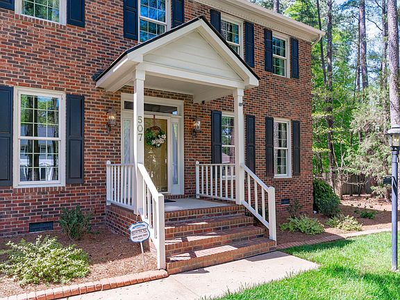 Classic all-brick 4-bedroom home, nestled among mature trees and thoughtfully landscaped grounds with irrigation system providing ample amount of shade for a more energy efficient home. The timeless appeal of the brick exterior exudes a sense of enduring elegance. Upon entry, you are greeted by a dedicated dining room, accommodating an array of table options. To the other side, a formal living room boasts French doors that seamlessly open into an inviting family room, where a cozy fireplace awaits, offering warmth and comfort. The heart of the home lies in the all-white kitchen, with its abundance of cabinetry and newly installed (2019) quartz countertops. Adjacent to the kitchen is a charming breakfast nook, complete with a built-in desk, ideal for enjoying casual meals or catching up on work in a sunlit space. Ascending the staircase to the second floor, you'll discover three spacious guest rooms, each offering a space for relaxation and personalization. The primary ensuite awaits, featuring a walk-in shower and Whirlpool tub, providing a private sanctuary for unwinding after a long day. Venturing further, the third floor reveals a hidden gem—an expansive finished space boasting double bonus rooms, offering endless possibilities for recreation, hobbies, or even a home office. Outside, the backyard is a wooded oasis, providing a tranquil retreat. A large deck beckons for outdoor entertainment, while stairs lead down to an extended patio, perfect for enjoying al fresco dining or simply basking in the beauty of the natural surroundings. With its classic charm, generous living spaces, and enchanting outdoor amenities, this home offers a perfect blend of comfort, elegance, and timeless appeal. Situated in the prime location of MacArthur Park located near Cary Greenway Trails, Bond Park, shopping and restaurants! Less than 30 minutes to RDU airport, RTP, Downtown Raleigh and Durham!