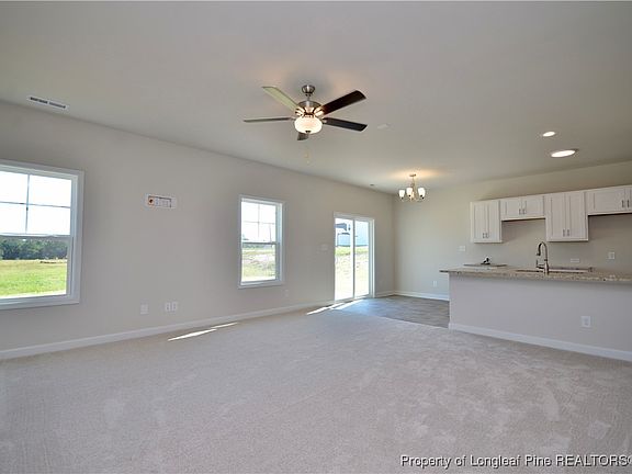 Limited-Time Builder Incentives! Receive $7,500 in buyer incentives when you use the builder’s preferred lender PLUS a standard refrigerator and blinds. Welcome to the Onslow CC1885! This open-concept new construction home greets you with a welcoming foyer with LVP leading a great room with carpet, perfect for gatherings open to the kitchen & dining area. The spacious kitchen features a stylish countertop bar, granite countertops, white shaker cabinets, a pantry, and stainless-steel appliances. Sliding doors from the dining area lead to a cozy grill patio, ideal for outdoor meals. Upstairs, the primary suite offers relaxation & comfort with two walk-in closets & bath featuring a dual sink vanity with quartz countertop, white shaker cabinets, and a separate shower & toilet area. Two additional bedrooms, each with their own walk-in closets, share a hall bathroom with a tiled tub/shower combo, a vanity & a linen closet. A dedicated laundry room is upstairs near all the bedrooms. Located at the end of a peaceful cul-de-sac, the exterior boasts low-maintenance vinyl siding with shake accents, a stone skirt, and dimensional roof shingles. The front door features a smart keypad for easy access. A spacious three-car garage offers plenty of storage. This Energy Plus certified home is equipped with fiber optic internet service & comes with a 1-2-10-year builder in-house warranty for peace of mind. Neighborhood offers a dog park, tot lot & walking trail. Only 15 minutes to Fort Bragg!