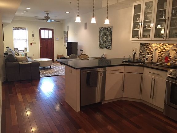 This elegant condo is truly an entertainer's delight. Revel in the features of this two bedroom one bath condo with a large terrace and private yard. Additionally, contemporary designer kitchen, hardwood floors and private entrance make this unit one of a kind. Distinctive finishes include stone countertops, Jenn Air stainless steel appliances, recessed lighting, surround sound, modern bath and individually controlled energy efficient gas forced central HVAC. Lovely flower beds, raised yard area and storage beneath covered deck. Rental parking nearby. A rare find in Hoboken!