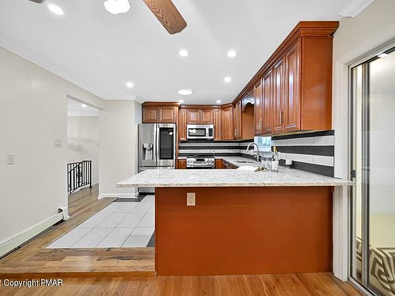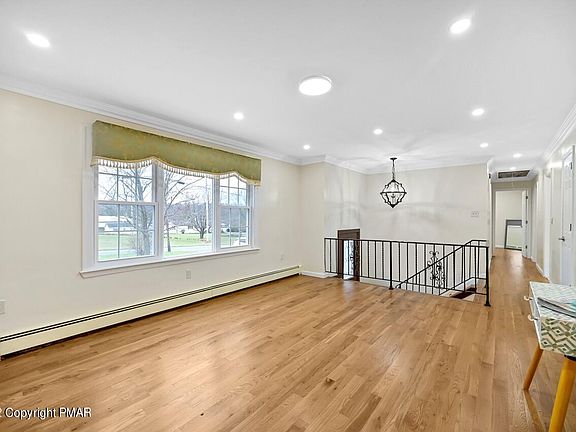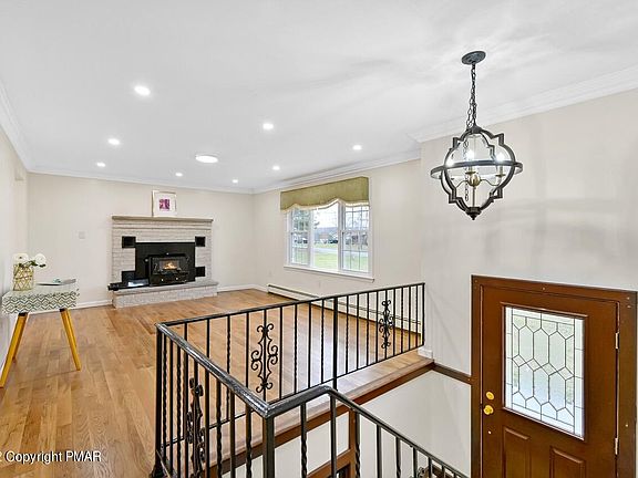 LARGE 3/6 Bedrooms, Totally RENOVATED Bi-level on 1.29 Acres of Flat Manicured Land in Beautiful Saylorsburg. Featuring Large Open Living & Dining Room; En-suite Primary Bedroom; 2 kitchens, 3 Full Baths, Jacuzzi; Lighted Rain Shower head w 6 Jets; 2 Fireplace; 2 Laundry. WALK OUT LOWER LEVEL with 2nd KITCHEN could be used for MOTHER/DAUGHTER/IN-LAW SUITE. 4-season Room could be used for office or LOUNGE. Recessed lights galore!! LARGE 3 vehicle 17 ft High GARAGE plus WORKSHOP or Storage. Too much to mention...Crown Molding, RADIANT HEAT on Kitchen Flr. Upgraded plumbing & Electrical, Electrical ready for Central Air; Hardwood floors, New Windows. Pleasant Valley School. Close to all Highways, Hospitals, Shopping, Recreation and Pocono Amenities. Commutable distance to New Jersey or New Yo