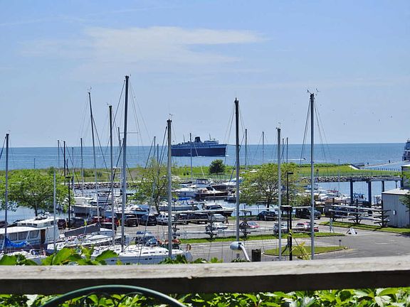 WOW! Stunning views of the marina, harbor and Lake Michigan! Charming 3 bd /1.5 ba Victorian with a 3-season room and deck overlooking Lake Michigan. Newer roof and central air. Family room features a gas Ben-Franklin stove and built-in bookshelves. Walking distance to the beach, marina, YMCA, restaurants, parks, farmers market, museums and more. Charming home in a one-of-a-kind location! This home needs a little TLC and could be an amazing second home or vacation rental. It is an estate and being sold as-is. East (lake-facing) side of home is vinyl., the rest is wood and needs painting.