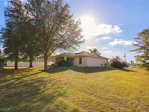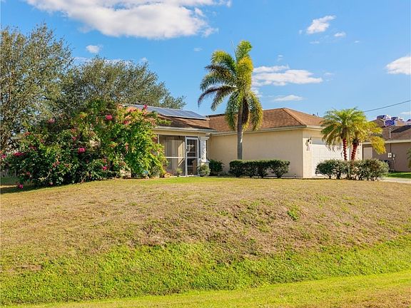 ***MOTIVATED SELLERS***This beautiful three-bedroom, two-bathroom house in the Mirror Lakes area of Lehigh Acres, FL is a perfect fit for first-time homebuyers or investors. With an oversized corner lot, stunning backyard with shade trees, screened-in lanai, central AC and heating, and a well water filtration system, this solid concrete house with stucco on the outside is low-maintenance, durable, and has all the necessary amenities for comfortable living. Estimated to be 2020 Frigidaire refrigerator & Range. Solar Pannels will be paid off upon the sale of the home.