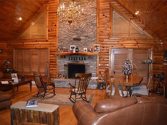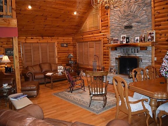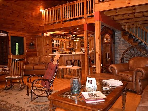 Beautiful Log Home Nestled in Nature on 8.29 Acres With Forests & Farms For Miles Around. Two Homes For The Price Of One! This Property Sits Just Up the Hill From Packsaddle Covered Bridge Along Pristine Brush Creek Stream. The Home Sports a Huge Wood Burning Stone Fireplace Spanning to the Top of the Vaulted Ceiling in the Great Room. Large Balcony Overlooking the Living Area & Big Windows with Stellar Views of Nature. Kitchen on Main Floor As Well As Lower Level. Huge Master Suite with Claw-Foot Tub. Integral Two-Car Garage. Spacious Wrap-Around Covered Deck To Enjoy the Changing Seasons. Nice Sized 2,100 Square Foot Log Guest House to the Rear with 2 Bedrooms, 1 Bath, & Single Car Garage. Lots of Extras & Privacy at this Property!!