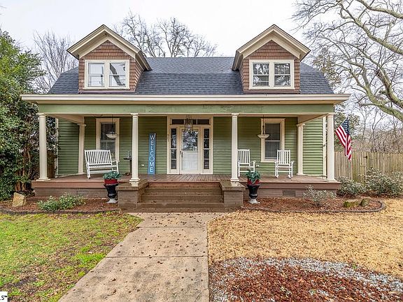 Could this charmer in Fountain Inn be YOUR next home? Built in the early 1900's-this home has so much character and charm! Stunning curb appeal with stately trees in the front and the All American white picket fence. Relax on the rocking chair front porch. Walk through the front door to your formal dining room on the right featuring gorgeous hardwood floors, beautiful chandelier, and natural light throughout. Walk straight into the updated kitchen with all white cabinetry-some window cabinets as well to show off your best dishes/kitchen supplies, large kitchen sink, and ample amounts of counter/storage space for all of your kitchen needs! On the left side of the home you will find your cozy living space with a gorgeous white electric fireplace-perfect room for entertaining or movie nights! Master is also on the main level (sellers currently use this space as an office) with an attached walk-in laundry room and full bathroom. There is also a half bath on the main level. Walk upstairs and find two spacious additional bedrooms (could also be used as master) sharing a full bathroom with dual vanity and large tub/shower. Upstairs bathroom is completely renovated. That's not all!! Walk out of the back door into your sunroom-perfect spot to drink your morning coffee and/or read a good book. ENDLESS possibilities for the enormous backyard-this home sits on .86 acres!! Paved porch area and tons of yard-ALL fenced in. Two covered carport spots as well as detached one car garage. The garage has an attached workshop area. Don't miss the former horse stable turned workshop/man cave. This shop has electric and is perfect for the man toys. This home has everything you can imagine, you won't want to miss seeing this one for yourself!! Systems that have been replaced recently: Roof (2021), HVAC (2021), water heater (2021). Downtown Fountain Inn has been BOOMING over the last few years! Just to mention a few attractions: farmer's market, carriage rides, restaurants, bars, parks, etc.-all of this a bike ride or walk away! Schedule your showing TODAY!