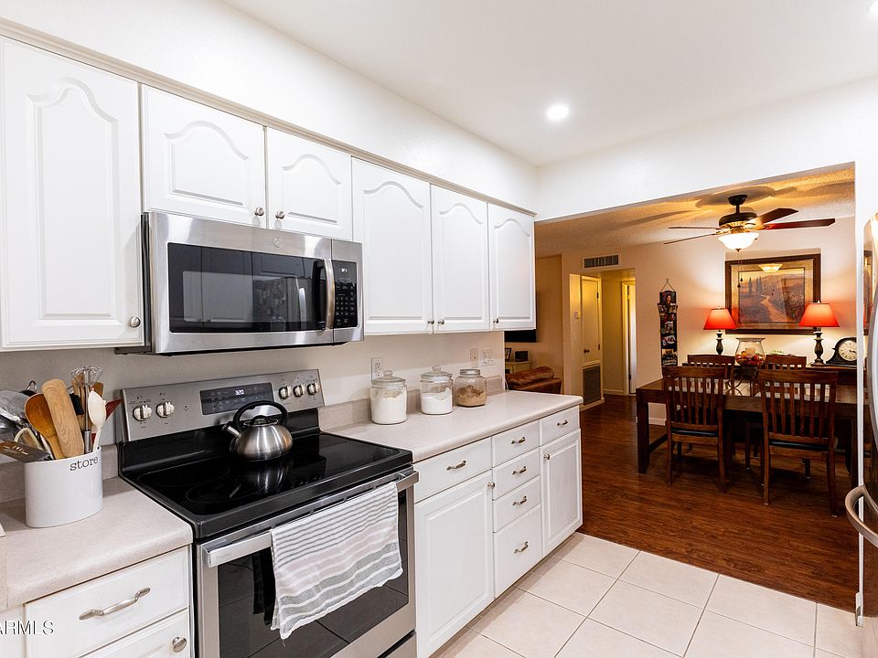 This sweet brick home is located in desirable Sunland Village, a 55+ active adult community that offers a wide range of amenities for its residents, including 3 swimming pools, a jacuzzi, Tennis courts and Pickleball courts, a Golf Course, hobby and craft rooms, and a variety of chartered clubs and special interest groups. The charming front courtyard is great for evening sunsets. As you enter the home, you will be greeted with a spacious living room, that flows openly to the dining room and family room. The bright galley style kitchen has white cabinetry, carbon water filtration system, microwave, range and dishwasher all replaced in 2020. Luxury wood vinyl floors, tile and carpet throughout. New Roof and HVAC 2021 Primary bedroom has a 3/4 bath and two spacious closets. Inside laundry room with washer & dryer replaced in 2022. Newly replaced 2021-22 garage door springs and Liftmaster.