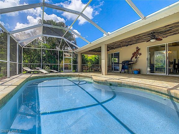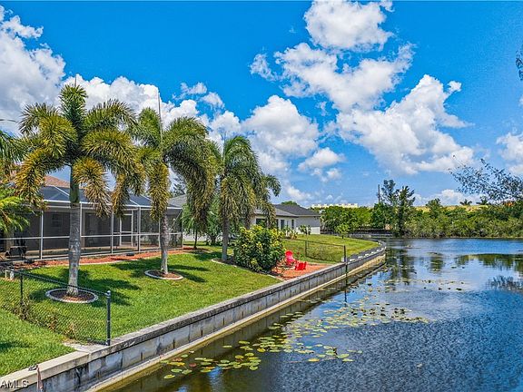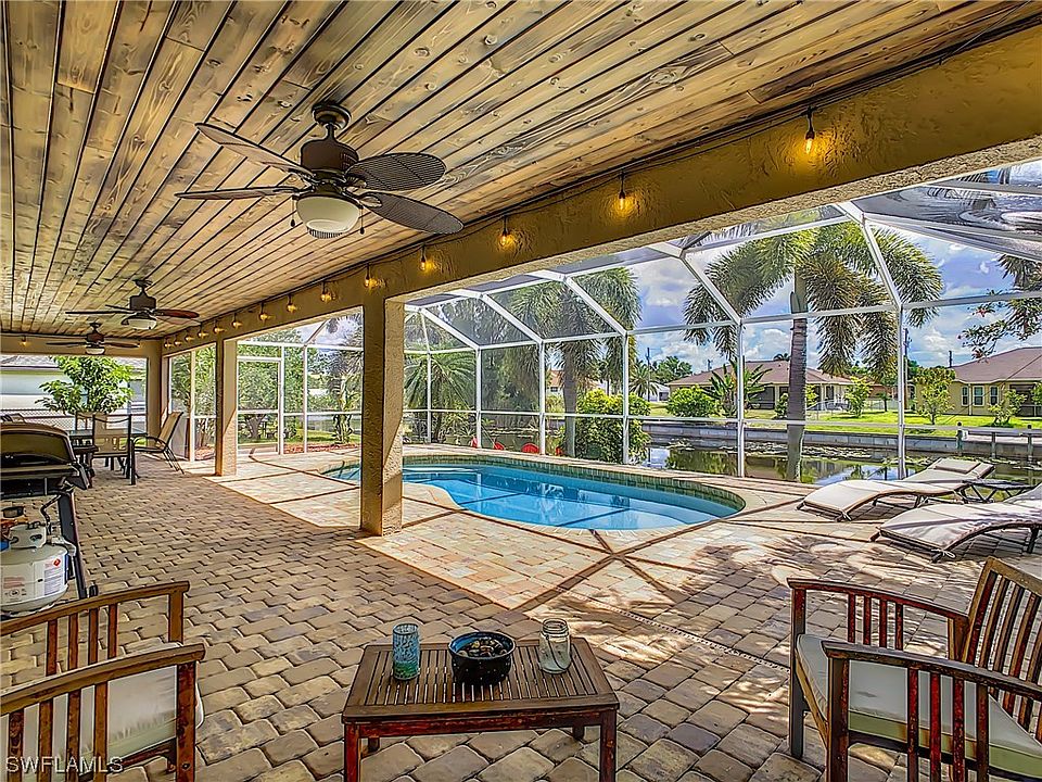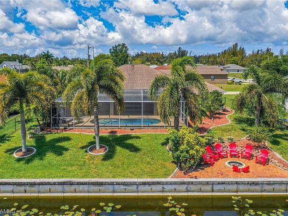 Welcome to this beautiful Waterfront Pool home in Coveted SW Cape Coral! This 4-bedroom, 2-bath residence boasts modern upgrades, including new quartz countertops in the kitchen and baths, sleek laminate wood flooring, and stainless steel appliances. The kitchen offers generous cabinet space and enjoy the convenience of a walk-in pantry. The property features a new roof, newer A/C, new pool heater, and a fenced-in yard for added privacy. Nestled on a canal, revel in the picturesque surroundings while taking a dip in the heated pool. Entertain on the expansive paved lanai and pool deck or unwind by the fire pit on the paved patio by the canal. Complete with a seawall, this home is perfect for boating, fishing, entertaining and is close to shopping, dining, and entertainment. Enjoy fishing and boating without the cost of being in a flood zone. Home is NOT in a flood zone. Lots of new construction in the area. Don't miss the opportunity to make this beautiful home yours! This home is on city water and assessments have been paid in full! A 2-10 Home Warranty will be included with purchase of home.