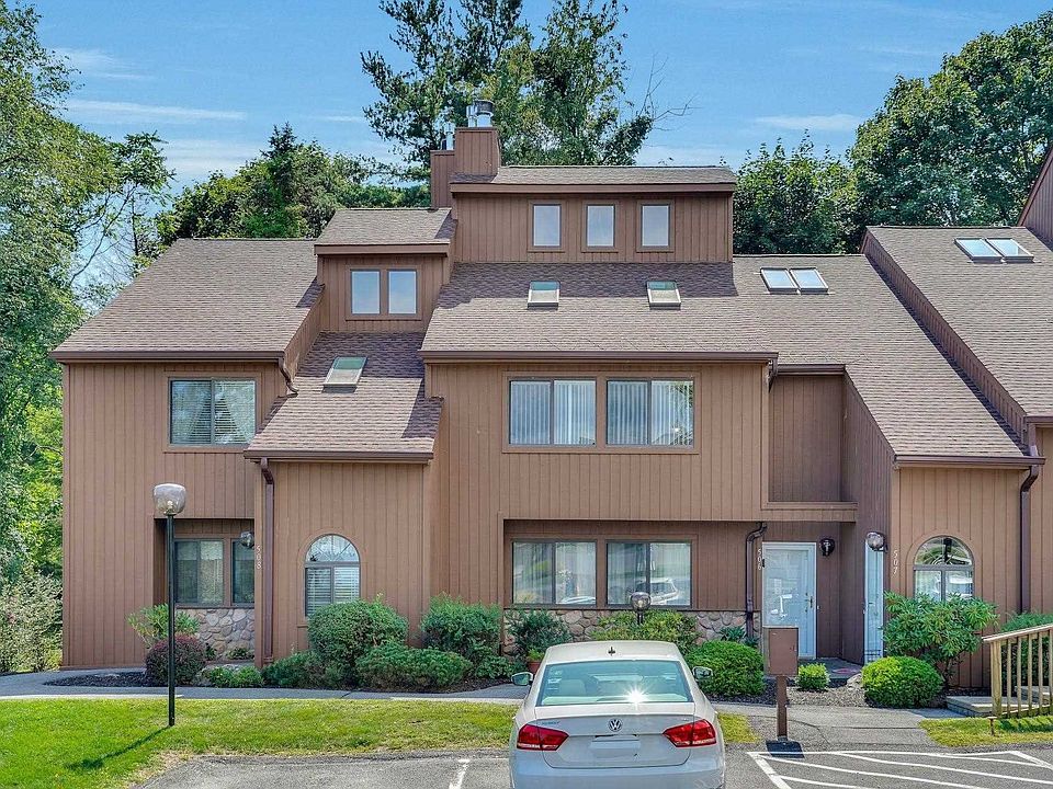Bright and sunny upper level condo in desirable Fox V community with nice views from front window. Oversized living room/dining area combination offers vaulted ceiling, gas fireplace and wall to wall carpet. Eat in kitchen has been updated with tile floor and new stainless steel appliances. Master suite with full bath, ample closets and sliders to deck. Second bedroom with sliders to deck. New tiled floors in both bathrooms and entrance hall. Washer and dryer in condo. Dryer is brand new. Energy efficient wall-mounted hotwater heater. Pull down stairs to a huge attic for loads of storage. Roof was replaced in 2018. Water/sewer included in common charges. Complex amenities include pool, clubhouse, tennis courts and pickle ball. Walking distance to shops, restaurants and Vassar College. Well maintained complex.