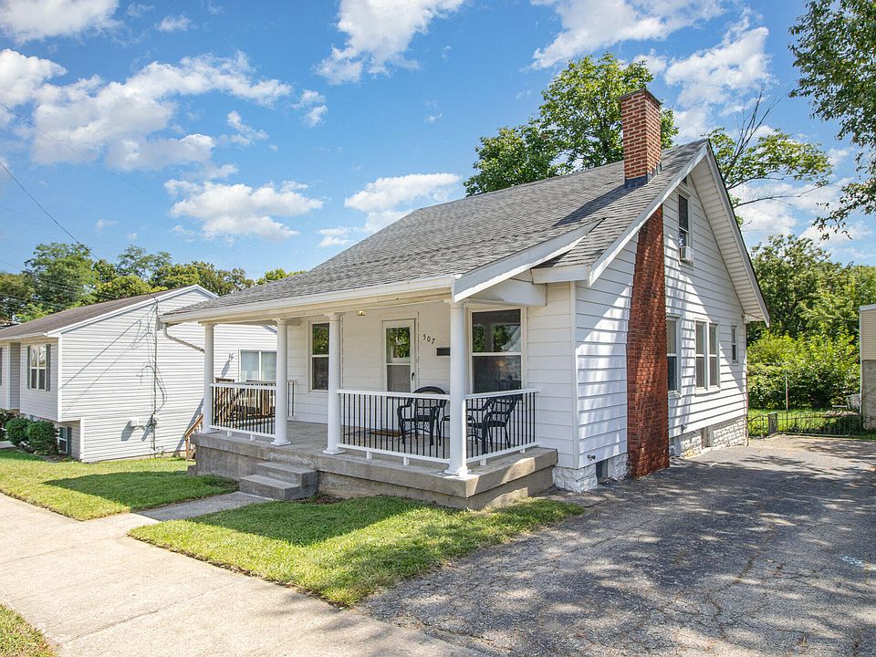 Charming Covington home just steps from the vibrant mainstrasse area and minutes to all major highways and downtown Cincinnati! This aluminium-sided gem with block foundation offers a welcoming front porch and driveway for three cars on a fenced double lot and patio area—lot is perfect for a future garage or even a tiny home. Inside, you'll find fresh laminate flooring on the main level, a brick fireplace, and a bright dining room with ceiling fan. The kitchen features stylish two-tone cabinets, granite counters, and stainless appliances including a gas stove. Flexible layout offers 3-5 bedrooms and 2 full baths, with a first-floor primary and an office/bedroom option. Upstairs boasts 2 bedrooms and hardwood floors, while the finished lower level adds living space with office/workstations, full bath, and private walkout—ideal for Airbnb or rental potential. Located one block from the Covington St. Elizabeth facility, this is a dream for investors or those seeking versatility. Oh and a Washer & dryer is included—move-in ready with endless possibilities!