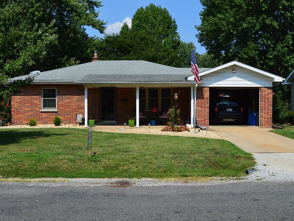 This full brick ranch home with 1 car attached garage is in Millstadt. Entering the living room with original hardwood floors, coat closet and natural lighting. The spacious kitchen eat-in has been newly updated with new cabinetry and counter tops. The hall hosts the pantry by the kitchen and the full bathroom. The bathroom has a linen closet and large vanity with additional storage underneath. The bedrooms are nice in size and have deep closets and ceiling fans. The basement is partially finished, but with your final touches will host an L shaped family room that's about 28 x 28 and features a bar, a half bathroom with laundry is also waiting to be finished. The utility side of the unfinished basement has shelves for extra storage. Large backyard is majorly fenced with chain link fencing with one side wood fence. The newly poured driveway has a basketball hoop.