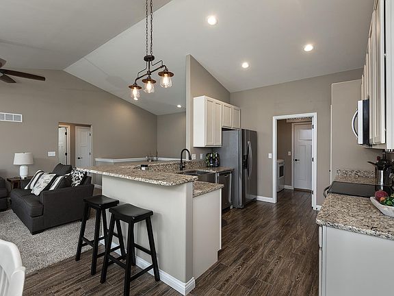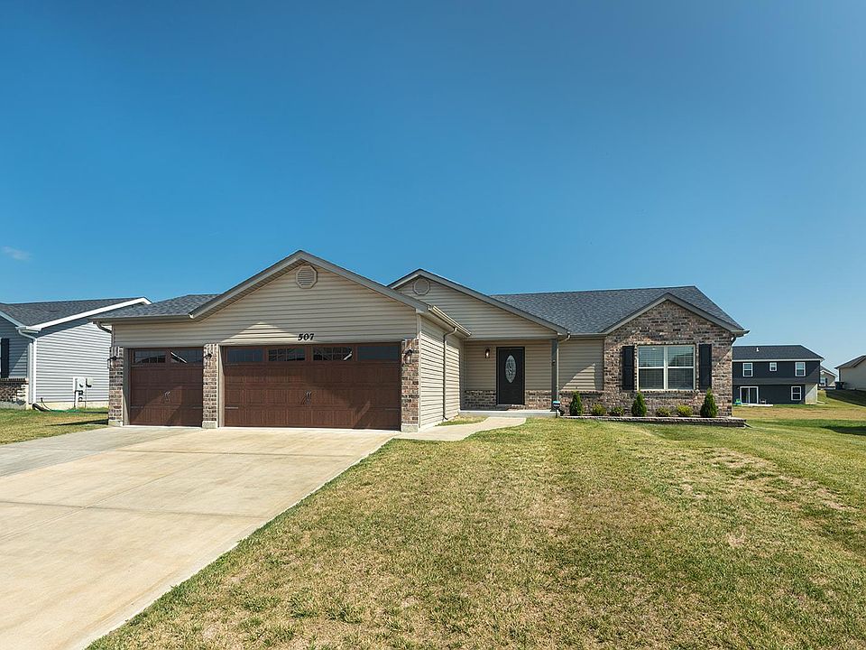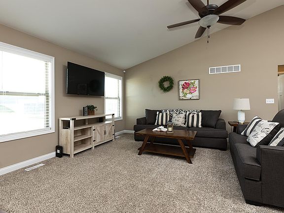WHY WAIT TO BUILD? YOU'LL FALL IN LOVE WITH THIS HIGHLY SOUGHT, CHARMING 3 BEDROOM, 2 BATH RANCH HOME IN TIMBER TRAILS SUBDIVISION. OPEN AND SPACIOUS AS YOU WALK INTO THE GREAT ROOM WITH VAULTED CEILINGS THROUGHOUT INCLUDING KITCHEN AND DINING ROOM. CUSTOM PAINTED AND GLAZED CUSTOM CABINETRY, 42" SOFT CLOSE AND GRANITE COUNTERTOPS. KITCHEN ALSO FEATURES STAINLESS STEEL APPLIANCES AND BREAKFAST BAR. WOOD LOOKING CERAMIC TILE FLOORS IN KITCHEN, DINING ROOM, LAUNDRY ROOM AND BATHROOMS. MASTER BEDROOM SUITE ALSO HAS VAULTED CEILINGS WITH LARGE MASTER BATHROOM. 72" ADULT HEIGHT, DOUBLE BOWL VANITY, SEPARATE JETTED TUB AND SEATED SHOWER. SPACIOUS CLOSETS THROUGHOUT INCLUDING WALK IN CLOSET IN MASTER BATH. LOWER LEVEL READY TO BE FINISHED WITH SUMP PUMP/PIT, PLUMBING ROUGH IN AND EGRESS WINDOW. ENJOY THE SUMMER NIGHT RELAXING ON YOUR BACK PATIO.