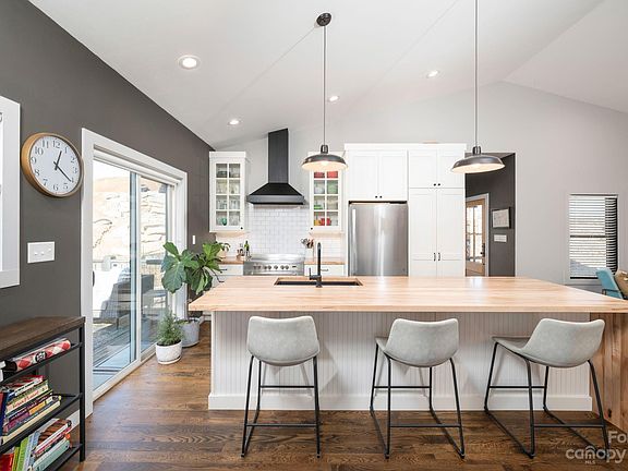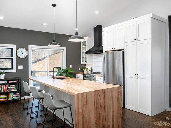 2021 Parade of Homes Viewers’ Choice Award winner! This innovative 3 BD/3 BA green- and custom-built modern farmhouse exudes craftsmanship from the moment you step inside. Located less than 20 minutes from downtown Asheville, in the heart of the Olivette neighborhood — a 366-acre planned community with riverfront park and fully operational, four-season organic farm with a CSA, farm stand, tailgate markets and other farm-centric activities, plus hiking trails, gardens, orchards, a dog park, and a private river island with pavilion and fireplace. The open-concept living area, with its vaulted ceiling, flows into the kitchen, which has a gigantic, maple butcher block island, providing ample workspace and seating. A large, hidden walk-in pantry provides tremendous storage. Full-house solar panels, geothermal HVAC, a huge wraparound front porch, and a back deck. The second bedroom on the main level functions best as an office, guest room, etc.