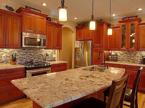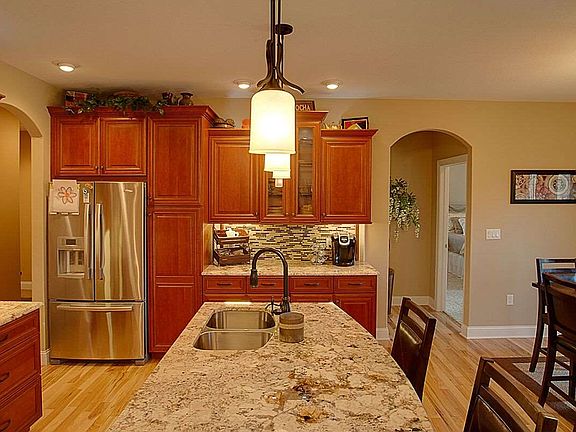 Spectacular quality throughout in this ranch style home located in the "Winding Ridge Estates Addition". From the moment you walk through the front door you take notice to the high quality finishes starting with the marble entry way that flows into the formal dining to your immediate left that offers hickory wood flooring through the formal dining room, living room and kitchen areas. Living room has a grand stone fireplace, kitchen offers a island with seating for 3 to 4, granite counter tops throughout, omega cherry kitchen cabinets with slow close drawers, stainless steel appliances and additional area for another kitchen table. Master bedroom with trey ceiling, slider to deck, walk in closet, amazing shower with granite and tile, two separate sinks for his and hers plus a Jacuzzi tub. There are also 2 additional bedrooms on the main level as well as a full bath with tile flooring. Main floor laundry room as well! Lower level is ready for entertaining! Awesome wet bar with granite counter tops, seating for several around the bar, pool table area, theatre set up with 3D Glasses and seating for six to enjoy the movie! Two additional bedrooms and full bath. Walk out lower level with brick patio and a spacious back yard that offers that much desirable extra room to run. Well manicured landscaping and irrigation to keep your lawn looking good all year round. These are just a few of the great features of this home. Come take a look!