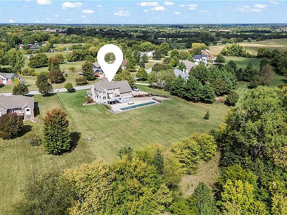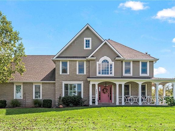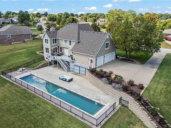 WISHING FOR LAND WITH A BEAUTIFUL HOME CLOSE TO THE CITY? This gorgeous home with inviting wrap around porch is the one! Located in Raymore, one of Missouri’s fastest-growing cities, this home offers so much for its next owner. Just 1.5 miles from the highway, you can reach downtown Kansas City in just 22 minutes! ABOUT THIS BEAUTIFUL HOME: Impeccably maintained and nestled on nearly 2 acres with a private backyard, this property features an inground saltwater pool with custom electric pool cover, large storage building just off the patio and plenty of space for gardening or outdoor activities. Inside, you'll find remarkable spaces and thoughtful details throughout. The main level offers two offices—one currently used as a piano room and the other as a cozy reading nook—alongside a formal dining room and a welcoming living room. The recently remodeled kitchen shines with custom white cabinetry, soft-close drawers and doors, a walk-in pantry, high-end appliances, and granite countertops. Upstairs, you'll find five spacious bedrooms, including a luxurious primary suite with a sitting area, an ensuite bath featuring double vanities, a walk-in closet, a separate soaking tub, and a walk-in shower. The walk-out lower level adds even more versatility, offering a large living area, an enclosed room ideal for a hot tub, a convenient dog washing station, and a 6th non-conforming bedroom with a full bath. This meticulously cared-for home combines peaceful country living with proximity to city amenities like shopping, dining, and easy highway access. Don’t miss the opportunity to make this dream home yours! There is a small annual fee to maintain the common areas, but there is no HOA in place.