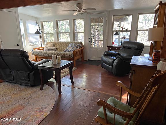 A truly rare find! This hidden gem is in a gated section of leased land in the Prescott National Forest and just a few minutes' walk to Granite Basin Lake. Relax in front of the massive stone fireplace in the living room. Sit on your patio and enjoy panoramic views of Granite Mountain, Little Granite Mountain, and towering Ponderosa pines. The cabin is a part of a rarely-available-for-sale community of nine cabins that sit at the foot of Granite Mountain. This off-the-grid hide-away includes a newer owned solar system, propane heat, stove, newer fridge, and hot water heater with a reliable well shared between the cabins. Access Prescott's world class hiking and mountain biking trails from your front door.