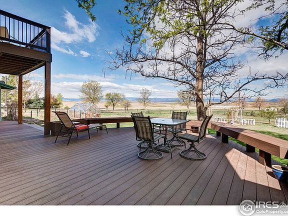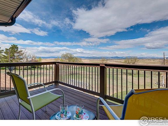 Enjoy the peaceful lifestyle & tranquil country setting of this 1.3 acre hilltop property. Multi-level deck to enjoy sweeping mountain views & sunsets. Mature landscaping. Updated chef's kit opens to expansive family room great for entertaining. New quartz counters, Jenn Air appl's, tiled baths & new flooring. Huge garage w/11 X 23 shop. Plenty of room for your toys, horses, chickens & gardens. 1 mile E of I-25/CO 56E & easy commute to Boulder, Longmont, Denver & other front range locales.