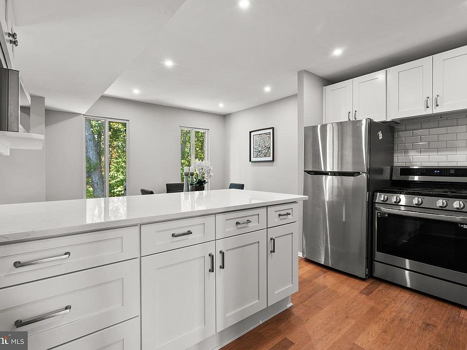 Welcome to modern sophistication in this bright and newly renovated 2-bedroom, 1.5-bath Arlington home in sought after Park Spring Condominiums with lovely park views! Located near Shirlington, the Pentagon, key commuter routes, and the W&OD trail, this home is situated in a quiet enclave with easy access to vibrant shops and restaurants offering an exciting and convenient close-in lifestyle! Step inside and you will find a separate entry foyer to welcome guests and gorgeous hardwood floors throughout. Next is the spacious living room with glass doors leading to a large balcony overlooking Tyrol Hill Park, extending your living space for al fresco dining and relaxing. The dining room is open to the brand-new kitchen where you have a breakfast bar, recessed lighting, new cabinets, all new SS appliances and sleek quartz countertops. You will love the gorgeous, newly updated bathrooms and 2 large bedrooms including the primary suite. And don’t miss the in-unit washer and dryer, loads of closet space, included storage area, community swimming pool, tot lot and basketball court, and 2 coveted parking passes. Gas, water, sewar and trash included in condo fee. Welcome home!