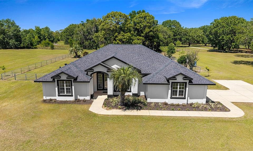 Welcome to your own slice of paradise in the heart of Anthony, Florida—one of Marion County’s most desirable and peaceful areas known for its rolling hills, rich soil, and quiet country charm. Situated on 10.19 acres of picturesque land dotted with majestic Grandaddy Oaks, this beautifully remodeled 3-bedroom, 2-bathroom home offers the perfect blend of modern updates and tranquil rural living—just minutes from Ocala and Gainesville. Originally built in 2001, the home has just undergone a top-to-bottom renovation with timeless design and contemporary finishes. The exterior exudes curb appeal with new crisp white paint accented by black trim, a brand-new black roof, manicured landscaping, and a welcoming walkway that leads to the covered front porch featuring a pine tongue-and-groove ceiling. A two-car garage adds functionality, while the backyard is chain-link fenced, making it perfect for your pets. One established paddock is already in place, with plenty of room to add more, along with a barn or additional structures to suit your equestrian or agricultural needs. Inside, you'll find nearly 2,300+ square feet, thoughtfully designed with both comfort and style in mind. The home features a spacious split-bedroom layout, freshly painted neutral walls, brand-new luxury vinyl plank flooring throughout, and high ceilings that create a bright, airy atmosphere. The kitchen is a showstopper, offering brand-new stainless steel appliances, Corian countertops, white cabinetry, ample counter space, and a large bar for morning coffee or casual meals. A charming breakfast nook with oversized bay windows offers sweeping views of the backyard, while a formal dining area provides space for entertaining. The layout includes a formal living room and a separate sitting area just off the kitchen, offering versatility for your lifestyle. The living room, kitchen, and master suite each feature French doors that open to the screened-in back porch—perfect for enjoying the peace and quiet of the surrounding countryside. Brand-new ceiling fans have been installed throughout, adding comfort and style. The master suite is spacious and serene, featuring a large walk in closet and a luxurious en-suite bath with double vanities, a glass-enclosed walk-in shower, and a sunken tub positioned beneath a window framing peaceful views of the land—perfect for relaxing after a long day. On the opposite side of the home, two guest bedrooms share a fully updated bathroom, while a large indoor laundry room adds everyday convenience. The land itself is truly special—gently rolling, fully usable, and ideal for horses, livestock, or simply enjoying the open space and natural beauty. The mature oak trees provide ample shade for animals and create a stunning backdrop for future additions such as barns, paddocks, gardens, or even a guest home. This peaceful country estate is perfectly positioned for convenience. Located less than 10 minutes from shopping, dining, and everyday amenities, and only 20 minutes from downtown Ocala. Commuting is a breeze with I-75 just 15 minutes away, offering easy access to Gainesville or Ocala. For equestrians, the property is just 14 miles from the World Equestrian Center and approximately 12 miles from the HITS showgrounds. Whether you're dreaming of building your ideal horse farm, enjoying a private rural lifestyle, or simply investing in a slice of Florida’s most sought-after countryside, this stunning Anthony property is the perfect opportunity.