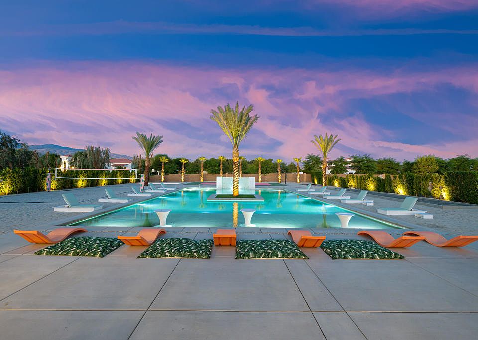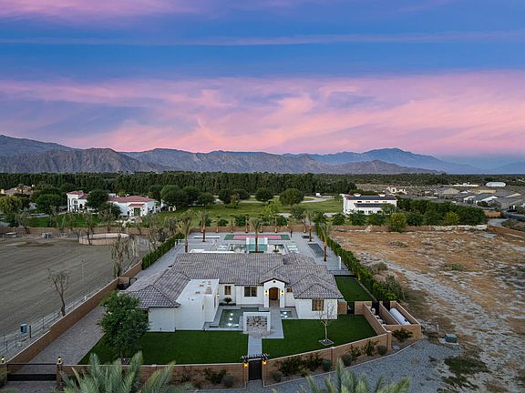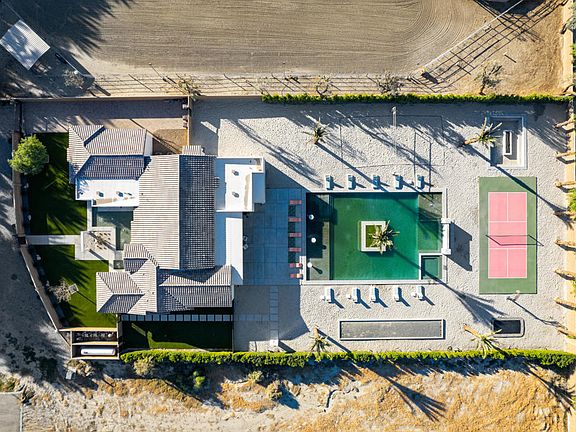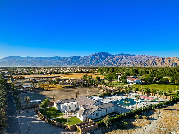 One-of-a-kind desert retreat on nearly an acre located by the Polo Grounds! Six bedrooms, five baths, approximately 3,993 sq. ft. newly built in 2020 with amenities and upgrades added in 2023. This double gated private estate has every amenity and recreation you could ask for from an amazing Olympic size pool with waterfall and inlaid spa to sports courts including tennis, volleyball, pickleball, bocce ball, basketball hoop and a trampoline. Custom step down fire pit, outdoor shower and doggie park. The home features a manicured front yard with custom fountain with bridge over walkway to entrance. Large great room with wood beamed ceilings, media and billiard area. Formal dining room and gourmet stainless kitchen with center island, breakfast bar and walk in pantry. Large master suite with custom closet and inviting bath with soaking tub. Your guests will enjoy a choice of five other suites and bedrooms. All this plus incredible panoramic mountain views makes for a perfect corporate retreat or rentable property for Coachella or other desert events with no HOA dues and short term rentals per the rules of the City of Indio. Offered turnkey furnished!