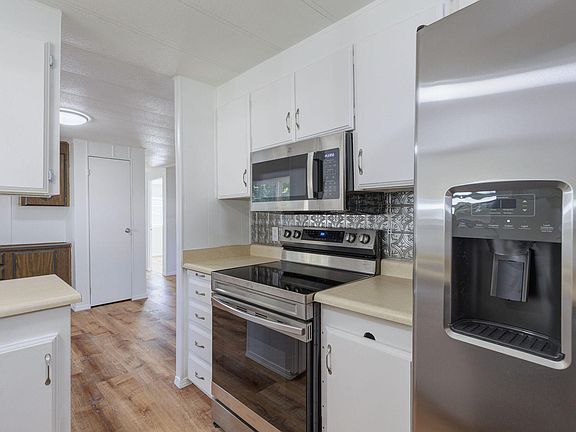 Nice, well maintained, move in ready, 1975 Guerdon Manufactured home located in Riviera Mobile Park. A 55+ community with Club House and access to river frontage. The newly remodeled home features a split floor plan with 2 bedrooms, 2 bathrooms, approx. 1056 sqft, Laminate floors, Living room and family room, new heat pump and double pain windows. Kitchen with all new appliances, R/O, DW, Frig and Microwave. Laundry room with washer & dryer. The front side has a Ramp leading to a covered deck and front door. The backside has a 1 car carport, with large storage shed/workshop, also accessible from back door in home. Low maintenance landscaping.