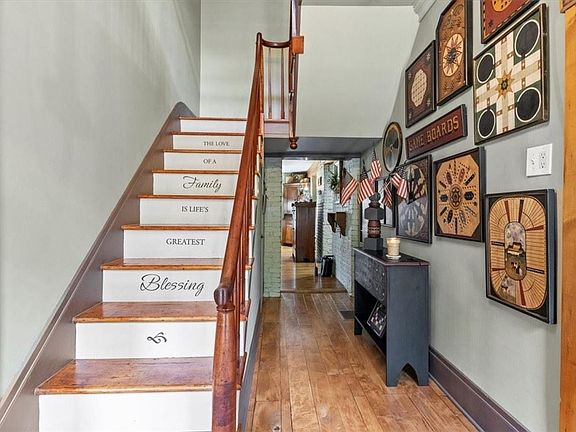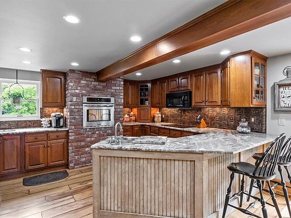 Escape to this picture perfect farmhouse situated on 2.61 acres with lush landscaping & expansive outdoor entertaining space. Stately brick front with wraparound stamped concrete walkway leads to the oversized garage accessible through the attached breezeway. Absolutely stunning, must see interior; extended family room with exposed brick walls and maple hardwood floors gives easy access to the covered rear deck. Well appointed kitchen boasts granite counters, ample cabinets & dazzling tin backsplash - outdoor entertaining made easy with sliding doors to the two tiered side deck. Decorative fireplaces are well showcased in both the formal dining and living rooms. Lavish owner's suite, designed with detail includes massive soaking tub, glass shower, dual vanity sink and walk-in closet. Second floor laundry with secondary hot water supply. Two additional well sized bedrooms on the upper level each have decorative fireplaces and are loaded with natural sunlight.