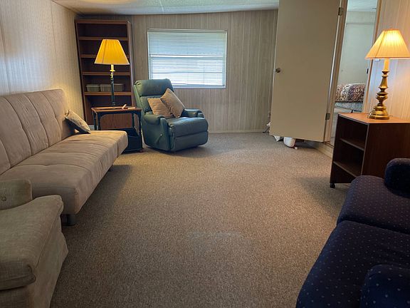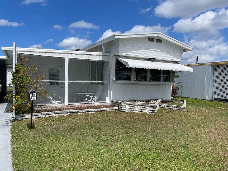 Available to Close Summer 2023 This 1967, 612 square foot under air, singlewide home, is set off the golf course; The Greens of Manatee golf Course. Several enclosures have increase the living space. Starting with a fortified screened enclosure, keeping you safe from bad golfers, and entering into an enclosed laundry and entry. From there, step into the living room or on to the enclose and insulated lanai. This is a great bonus room that could easily be converted or used as a private bedroom. The bedroom is roomy with two full size closets and a vintage wrap around vanity and built-in dresser. A king size bed is a comfortable fit. A built-in hutch and 3 pantry closets escorts you into the kitchen. Plenty of storage here with a mid-century modern ceiling and light feature. The living room is where it's at with an uninterrupted view of the golf course. The home is offered turnkey furnished. Disclosure: Village on the Greens Park is being sold. Closing cannot take place until the Park sale is final. This will be a Land Lease lot and does not include real estate. Future Market Rent is unknown. Village on the Greens is gated, 55+, pet free community. The community offers swimming pool, shuffleboard, library, clubhouse and a host of social activities. Sub-renting is allowed following park guidelines; 3 month minimum and 6 month maximum. Background check and approval is required. AGENT MUST SHOW BY APPOINTMENT 508 44th Ave E Lot N-43 (Heather Hills Dr.) Bradenton, FL 34203