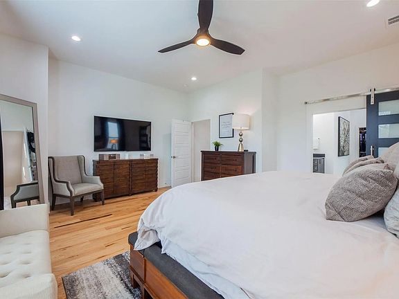 Private backyardWood flooringOpen concept kitchenCustom cabinetryLuxurious primary bathroom