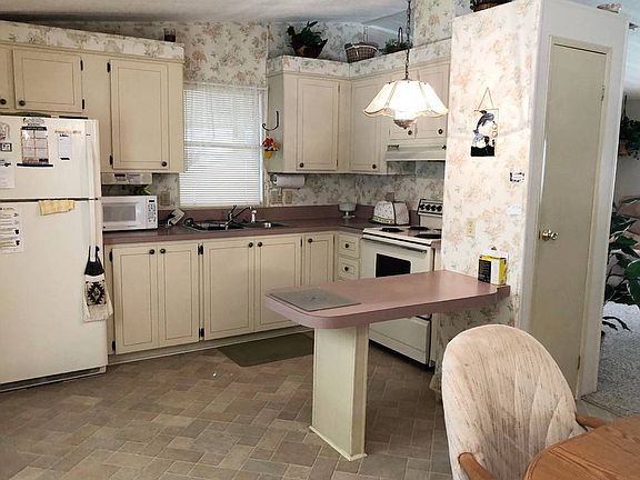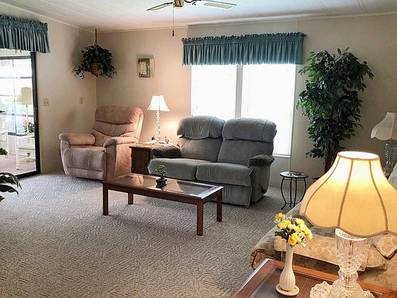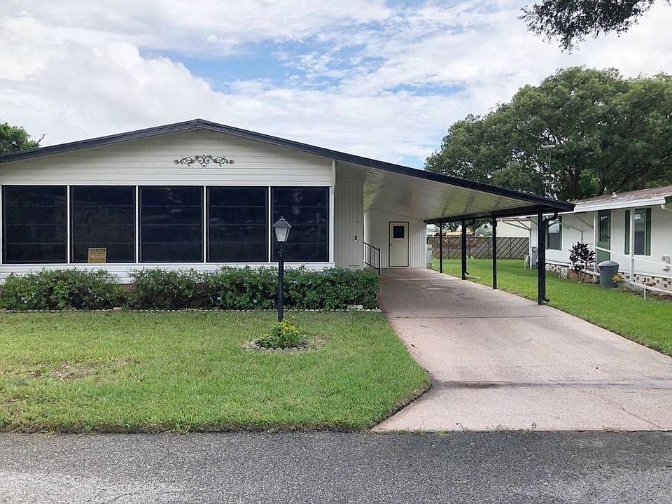 WELL-LOVED HOME..........This well-maintained, open concept home is situated on a large, outer perimeter lot right across the street from the clubhouse. In this lovely gated 55+ community, homes are on lot leased land. You own your home but pay lot rent. The amenities that Kings Pointe has to offer are at your fingertips, so to speak...... Special features include: a good working kitchen that has a front-facing window overlooking the front yard and over to the clubhouse; spacious living room; a built-in hutch in the dining area to store special china and glassware; a large 10×22 front-facing vinyl windowed/screened & carpeted lanai that is furnished. Here you may sit and watch all the action of the community and enjoy the warm afternoon Florida sun...... The long driveway can accommodate several vehicles and even offers room for a little outdoor seating area, if you so choose. The 8×10 utility shed is stocked with various items and has room for storage of miscellaneous items and equipment...... Updates include: New AC in 2005..... Updated tie downs in 2010 (making your insurance company happy)..... New carpet throughout the living/dining area in 2008..... Kitchen floor in 2012..... New bathroom sinks and lighting in both bathrooms..... New vinyl windows on porch in 2015..... New duct work under the home in 2019.......... This home is worthy of a personal tour in the search for your retirement home. The home is being sold pretty much turnkey, excluding the homeowner's personal belongings and special possessions. All you need is your toothbrush and your own personal things to make this a great place to call home. Call for your appointment today to see this well- loved home first hand.