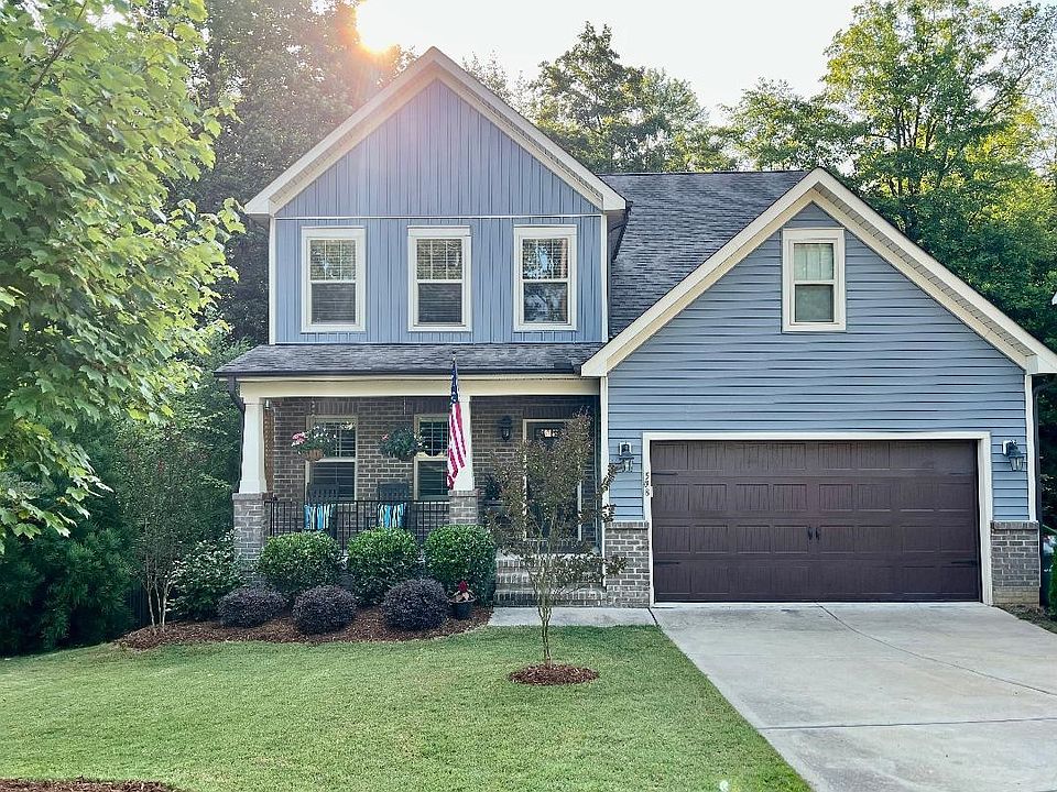 Craftsman 4 Bedroom Home, Sanctuary Floor Plan, with Master Bedroom Owners Suite on Main Level, Formal dining room, Open Family room into the Kitchen with large island. Custom trim/millwork, throughout downstairs living areas, coffered ceiling and wainscoting in dining room. Oak tread staircase,some plantation shutters, tile baths and laundry. Laminate hardwoods downstairs. Granite tops, tile backsplash, stainless steel appliances in kitchen.Smooth Ceilings. Covered screened in porch, rocking chair front porch, fenced in back yard, landscape lighting, tons of storage and large walk in craw space. Private cul de sac, great location to surrounding areas, Fuquay Varina address but also close proximation to c Apex and Cary.