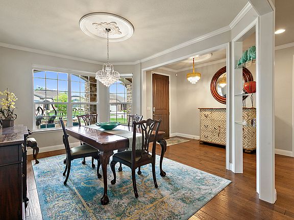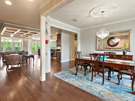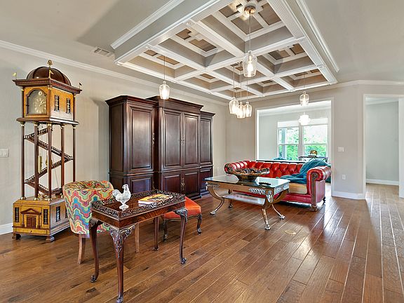 Beautifully designed and highly upgraded, this special home is an entertainer's dream featuring a spacious floorplan with generous living areas indoors and out. With more than 3,300 square feet, the main level includes a family room with dramatic coffered ceiling and pendant lighting, formal dining, study, hearth, and gathering rooms. An open kitchen with island seating, stunning quartz counters, and custom tiled walls draws attention to the chef's kitchen. The professional-grade KitchenAid appliances include a four-burner gas cooktop with griddle, stainless vent hood, double ovens, and counter depth refrigerator. The owner's suite is a retreat unto itself and has been remodeled to convert windows into sliding doors that lead to the covered terrace overlooking the greenbelt views. The luxurious bathroom has an oversized walk-in shower, body jets, double sinks surrounded by exquisite marble countertops, and a huge closet with built-in shelves. A secondary bedroom and full bath, as well as the laundry room with a sink and shelving are located on the main level. The upper level includes a private guest suite, full bath, large living space, and walk-in attic storage. Outdoor areas include a patio and covered porch on the front of the house and a customized large covered back terrace with a built-in grill, sink, hot tub, water feature, and a fire pit. Features List: Extensive Hardwood Flooring Commercial Grade Appliances Including Washer/Dryer and Refrigerator Hunter Douglas Blinds Double Crown Molding in Various Rooms Designer Lighting and Ceiling Rings and Medallions Coffered Ceiling Quartz Countertops Upgraded Kitchen Cabinets Decorator Tile Work Granite Countertops in Baths Barn Door Attic Storage 17 x 9 Custom Drapery Laundry Cabinets and Sink Sliding Doors to Patio from Owner's Suite Hot Tub and Fire Pit Outdoor Grill and Sink Water Feature Knox Box for Security