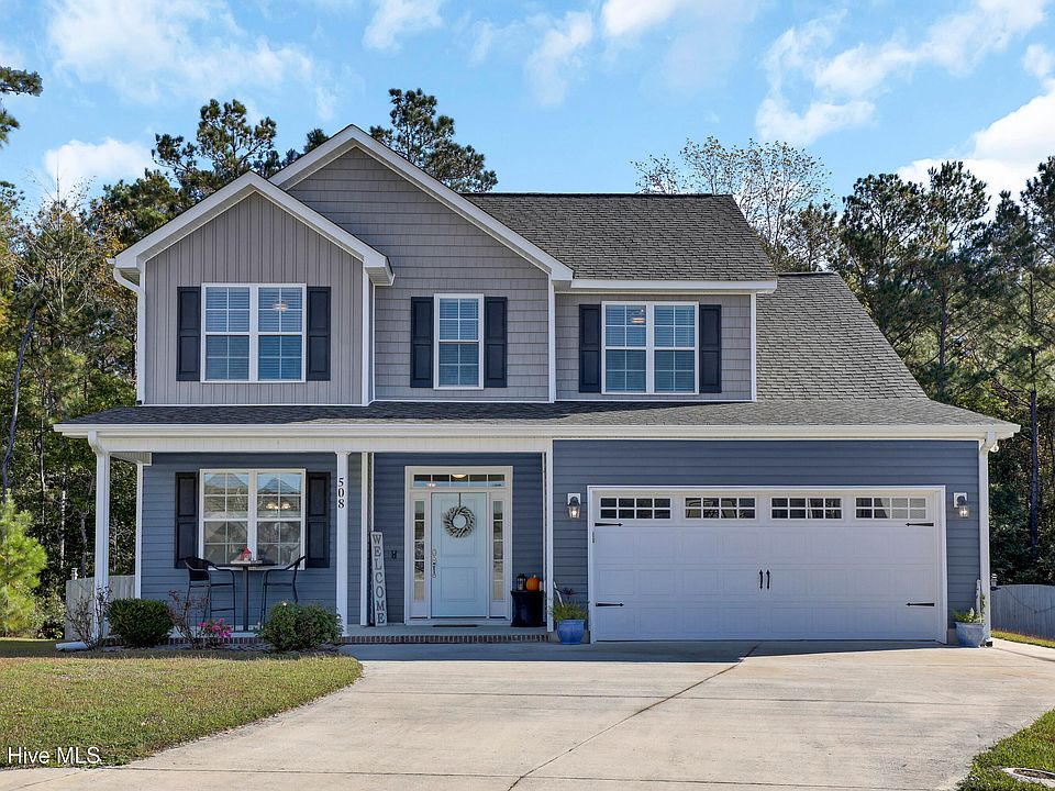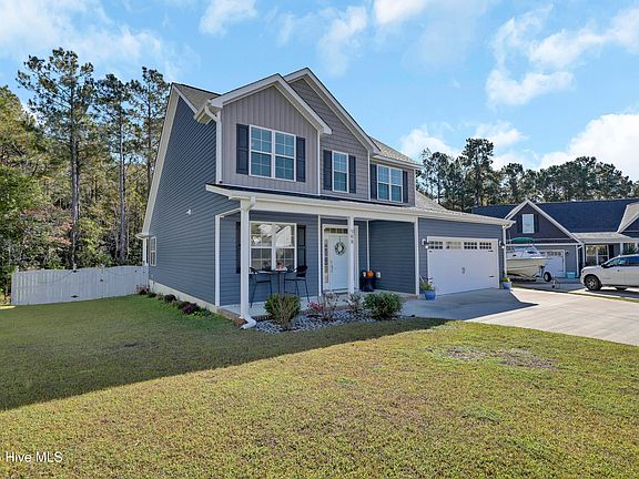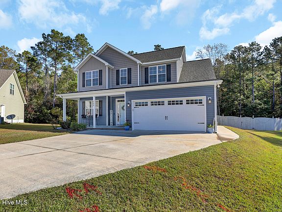 Swansboro's newest listing is a must see! Located in Shadow Creek subdivision. This home offers 3 bedrooms, 2.5 bathrooms and .41 acres of land. This home has lots to offer: First floor offers a spacious foyer, sitting room, half bath, modern kitchen, living room, laundry room and primary bedroom suite. First floor has 9ft ceilings with crown molding and LVP flooring. Kitchen is open to the living space with a large sink kitchen island, stainless steel appliances, recessed lighting, pendant lighting and kitchen nook dining space. Living room has a pushed-out fireplace which allows for tv and other electronic items. Primary bedroom suite has a large walk-in closet, and a large primary bathroom. Primary bath has a soaker tub, walk in shower and dual vanities. First floor also offers a large laundry room, access to the two-car garage and access to the back-covered porch. Taking the carpeted stairs to the second floor, you will find two bedrooms, full bath and an open landing area for a play space or office/ work area. The second floor has crown molding, LVP flooring and a walk-in attic that allows for additional storage and easy access to the HVAC for service. Slatted blinds throughout. This home offers a covered front and back porch. The back porch is large and open with two ceiling fans. Porch overlooks the woods. Enjoy listening to and viewing wildlife. Fenced in backyard with a concrete pad fire pit area. Great for nights sitting under the stars. Washer and dryer convey. Property is in the township of Swansboro but located in Hubert NC. City and county taxes apply. HOA dues are currently $75 a year. Some furnishings are negotiable. This home is located within minutes of the town of Swansboro, Cape Carteret, Emerald Isle and Crystal coast beaches. Military base Camp Lejeune is nearby via the back gate off Bear Creek Road. Schedule a showing today!