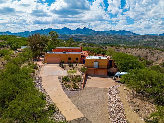 On top of the world with 3176 square feet of living space, 360 degree views, and a cobalt blue 36ft long tiled pool. No HOA and no CCRs! In the 2607 sq ft main house most ceilings are Redwood tongue and groove boards. The elegant Great Room and Dining room also have Redwood beams. The main house has a master bedroom with a walk in closet and a separate sitting area. There is a guest bedroom with a full bath, a welcoming foyer entry area, and a custom Mexican Colonial kitchen. The 569 sq ft Casita has a large sleeping/living area with a full bath, a walk in closet , and a kitchen area. There are two single car garages below the casita that can be used for vehicles, storage, or a workshop. Most windows have been recently replaced with Renewal by Anderson. The current owners have done many upgrades and improvements including a new pool heater, decorative iron fencing around the entry area, a new HVAC unit on the main house, a new mini-split for the Casita, and new decorative sidewalk and entry stonework. There is a large garden area with raised boxes if you want to work on your green thumb. There is room for RV parking with a 30 AMP outlet. Remember, no HOA or CCRs to prevent RVs, trailers, or other vehicles.