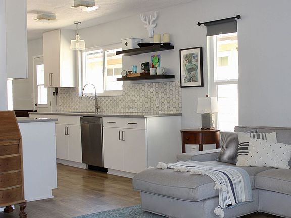 UPDATED BEAUTY! UNIQUE LAYOUT! Updated features everywhere! Pergo flooring in all main living areas. Living room gas fireplace. Dual pane Milgard windows throughout. Immaculate kitchen with quartz counters, marble backsplash, deep Kraus stainless sink and faucet with Samsung stainless appliances, white cabinets, and chic lighting. Kitchen is open to living and dining. Master bedroom has private access to patio, walk-in closet and high-end Hunter fan. Ensuite master bath has double sink with marble top, Kohler faucets, tile floor, new iron tub and tile shower/tub backslash, with matching new Kohler fixtures and toilet! Hall bathroom tile matches master and has matching Kohler toilet. Other two bedrooms are a great size with Hunter ceiling fans. New swamp cooler (May 2020) and newer LG washer/dryer in laundry nook all part of the package! Smartly xeriscaping in front and back with automatic irrigation. Great covered patio for BBQs including covered area with outdoor ceiling fan. Perfect backyard hangout-- sidewalks, pavers, shaded pergola, storage shed, and cool rock riverbed. Detached garage has private sidewalk entry into rich wooden walled annex. AMAZING FEEL INSIDE AND OUT!