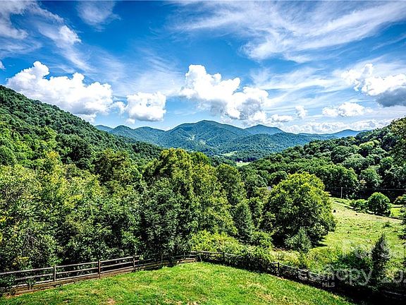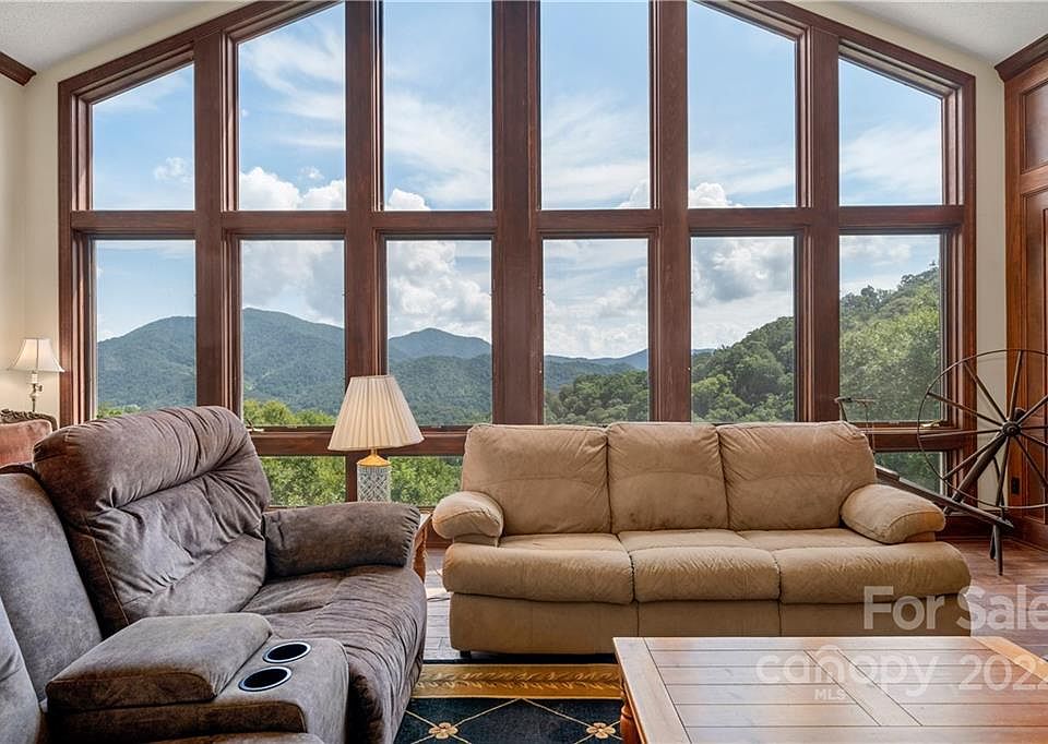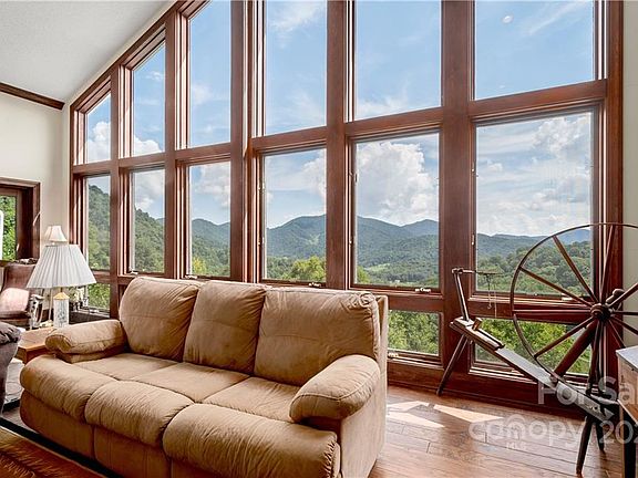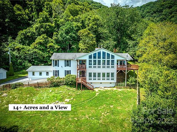 Extensive MOUNTAIN VIEWS on 14 ACRES with open house plan and four fireplaces near Asheville.. Great room has Vaulted ceiling featuring a 2-story stone see thru fireplace, impressive wall of floor-to-ceiling windows, huge Dining area, Kitchen with fireplace, expanses of wood floors, wood Judges paneling.. Freshly Painted interior.. The cozy Sun Room with fireplace and wrap-around windows adjoins an open Kitchen with great counter space, storage and access to two porches and a deck. This Spacious area has Room for Billiards and farmhouse dining table next to kitchen.. small "Pasture" is partially fenced, "Dog yard" is fenced.. "Wooded" up to the ridge line in back.. Basement includes Main Suite with wall of VIEWS worth awakening for, a gas fireplace, and en-suite bath with whirlpool tub and huge tile walk in shower, a Tiled media room and a Library/Office/den/sleeping area with VIEWS. Paved Access to kitchen door. Gorgeous rural neighborhood is 16 miles from Asheville. AT&T DSL internet