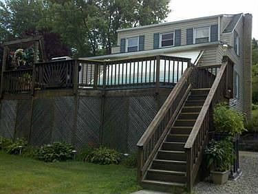 3 bedroom cape cod, with large living room, formal dining, large family room with french doors leading to a large deck over looking the one acre, large covered front porch.