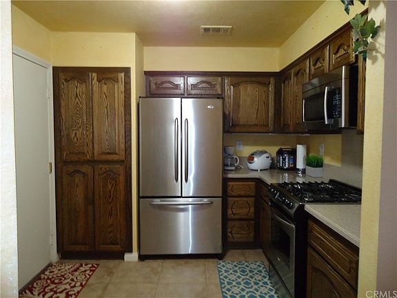 A lovely upgraded home is move-in ready! It located in a great & quite neighborhood. This warm cozy home features an 18" porcelain tile, Mohawk Stain-free Carpeting and dual pane windows. There are stainless steel appliances and LG Hi-Mac countertops in the kitchen. Mirrored wardrobes and ceiling fans in both bedrooms. Also has alarm system installed. Spacious living room with brick fireplace. A large master bedroom has a walk-in closet and dual sinks in the bathroom. Two-car garage with plenty of storage space. Sliding door that leads in the backyard with concrete flooring. Well design garden grows various flowers, vegetables and fruit tree. There is a extra space for parking in the front and also has a park with playground & school near by. Come check it out!