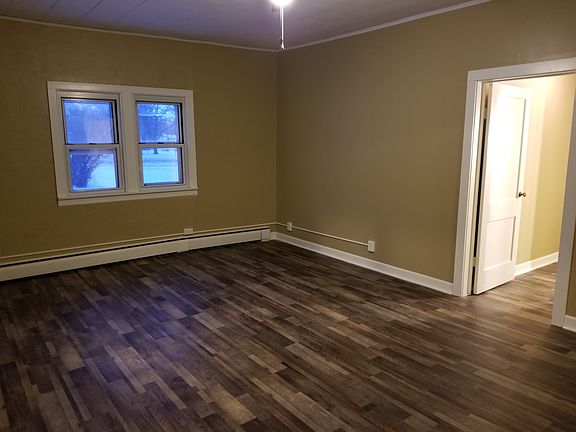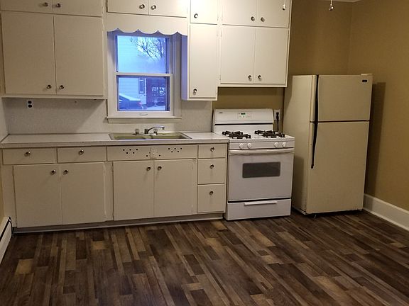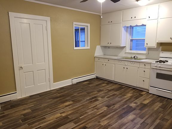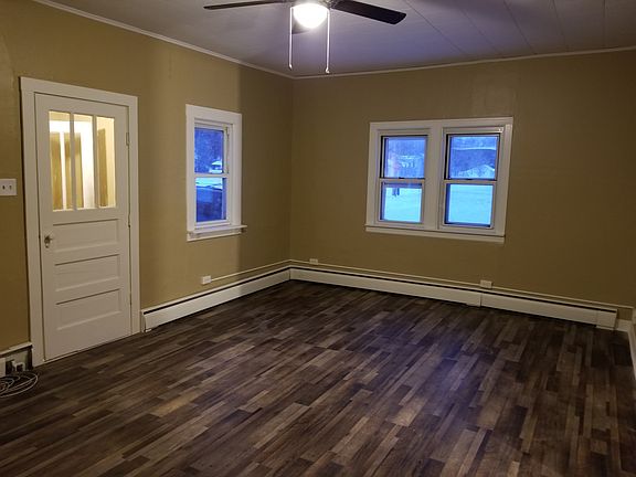 Be the first to enjoy this newly renovated house. All new flooring, paint, and light fixtures. Everything is ready for move-in today!This house features three bedrooms, a newly remodeled bathroom, a laundry room with washer and dryer included, a large eat-in kitchen featuring a range and a fridge and room for a big table, and a large family room. There is a front vestibule to keep the house warmer as you enter, and the back doorway features a wood deck. The yard is large and includes several storage sheds and garages, as well as a clothes line and a mature apple tree that has produced a lot of apples. There is a driveway and garage for off-street parking. Storage is available in the attic (reachable by pull-down stairway) and the unfinished basement.