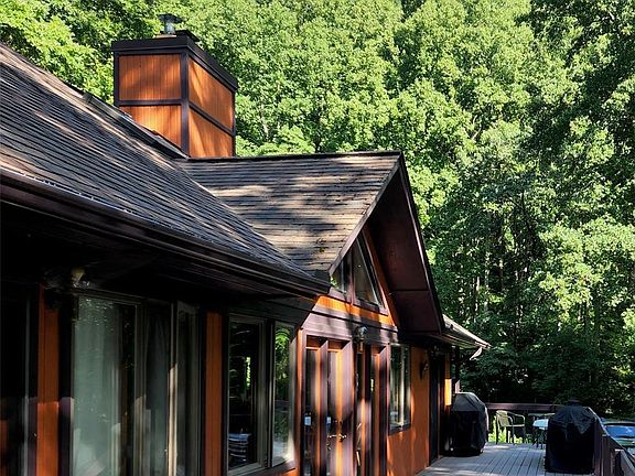 Floating stairs lead to the 2nd floor bedroom suite with full bath and library with built-in bookshelves. Enjoy (or expand into) an 823 sq ft shop not included in house square footage.This serene setting lies on 17 private acres in the Ox Creek community, just 1.5 m from the Blue Ridge Parkway, 10 m from downtown AVL and 7 m from downtown WVL. Price improvement,below recent appraisial