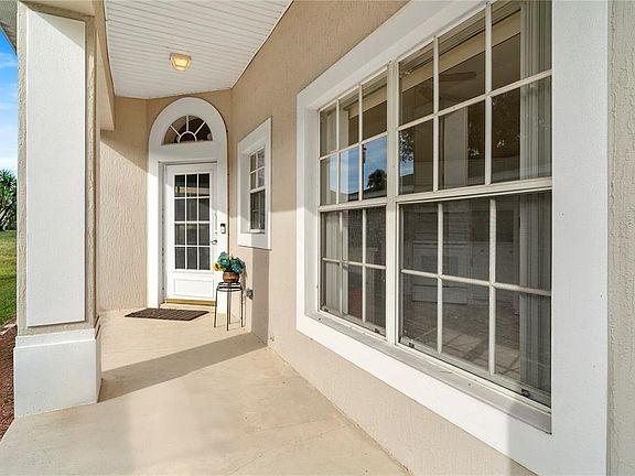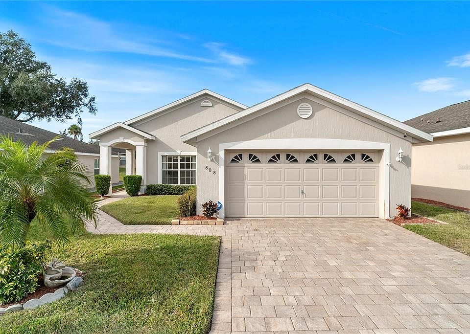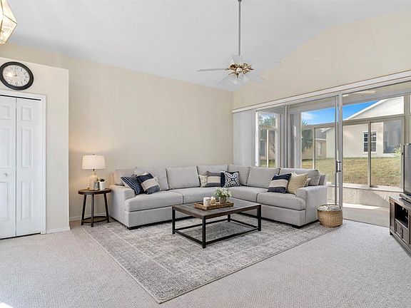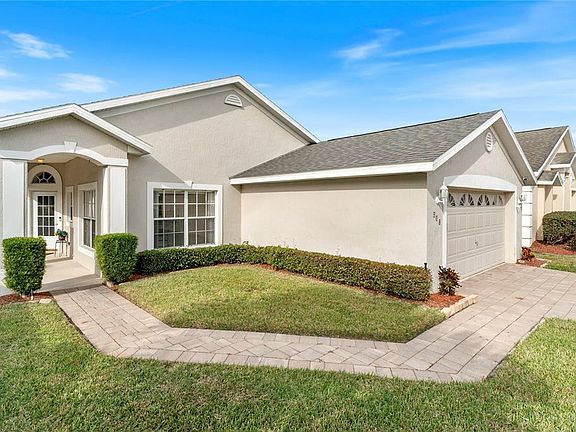 One or more photo(s) has been virtually staged. Enjoy effortless Florida living in this RidgeMont 2-Bedroom, 2-Bath plus home, ideally located on one level within the gated 55+ High Vista community of Ridgewood Lakes. Just steps from High Vista’s private clubhouse and outdoor amenity center, this home offers comfort, convenience, and an active lifestyle. A brick-paver driveway and walkway lead to a charming covered entry. Inside, the vaulted great room is filled with natural light and opens to an enclosed west-facing lanai, perfect for relaxing evenings. The eat-in kitchen features white cabinetry and countertops, and a large pantry. The split bedroom floor plan offers privacy for both homeowners and guests. The primary suite includes a spacious walk-in closet with a private bath featuring dual sinks, soaking tub, walk-in shower, and ample storage. A guest bedroom and office share a full bath with a generous linen closet. Additional features include an indoor laundry area with utility sink, a 2-car garage with insulated door, opener, keypad entry, and HOA benefits include lawn care, Spectrum internet and basic cable, and exclusive access to the resident-owned 12,000-square-foot High Vista clubhouse, offering a heated pool and spa, fitness center, library, pub, and a full calendar of social activities. Residents also enjoy pickleball, tennis, bocce, shuffleboard, and miles of walking and biking trails. The gated community provides 24/7 staffed security and private road maintenance. Golf-cart friendly and adjacent to the White Heron Golf Club, this home is conveniently located near shopping, medical facilities, AdventHealth Hospital (3 miles), SunRail, major highways, and Central Florida attractions. Sold As-Is. A wonderful opportunity to enjoy an active, maintenance-free lifestyle in a welcoming 55+ community