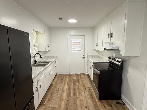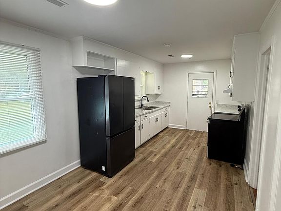 Roomy living room with ceiling fan and hardwood floors. Lovely eat in kitchen features LVP flooring, wood cabinetry, stainless steel stove, fridge, updated countertops, and easy access to the yard. Down the hallway you will find three spacious bedrooms with plenty of natural light, hardwood floors, ceiling fans and ample closet space. Hall bathroom has brand new LVP flooring, tub with tiled surround and vanity for additional storage. Off street parking with driveway and attached carport. Washer and dryer connections. Central HVAC. Large front and backyard. No pets please. No smoking. Available Now!
