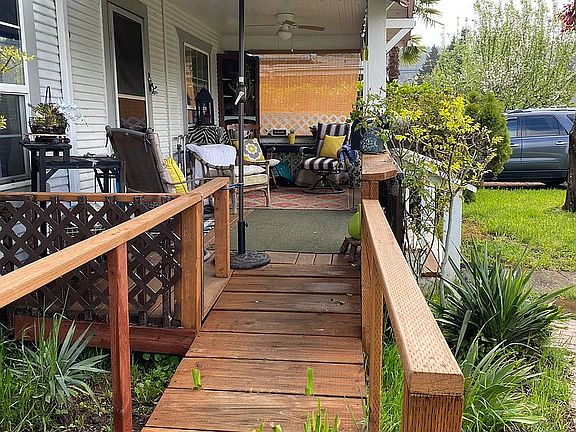 Spacious front porch, ADA ramp off parking, high ceilings with fans, lots of kitchen counter space, pantry, nice size bedrooms. Enjoyable relaxing backyard with fire pit, small garden and fruit trees.