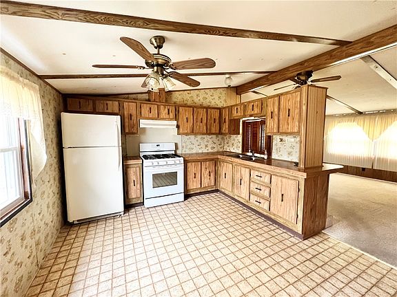 A car enthusiast or hobbyists dream awaits! Enjoy comfort and simplicity in this move-in ready manufactured home complimented by a huge 40x24 garage with heated tool storage room providing plenty of space for trucks, quads, tractors, bikes and boats. Home presents an open and airy interior flaunting soaring vaulted and beamed ceilings adding a touch of rustic flair. The sun-drenched living room is underscored in neutral carpeting and illuminated by a double window. Rustic beamed ceiling continues into the eat-in kitchen showcasing abundant cabinetry. A laundry room is conveniently located off the kitchen offering prompt access to a spacious rear deck overlooking a private wooded backdrop. The owner’s suite is accompanied by a full bathroom and walk-in closet. Super spacious garage is equipped with (2) 8x8 doors and (1) 10x12 overhead door along with plenty of paved off-street parking. Ideally sited at the end of a non-through street affording peace and quiet with easy access to I-376.